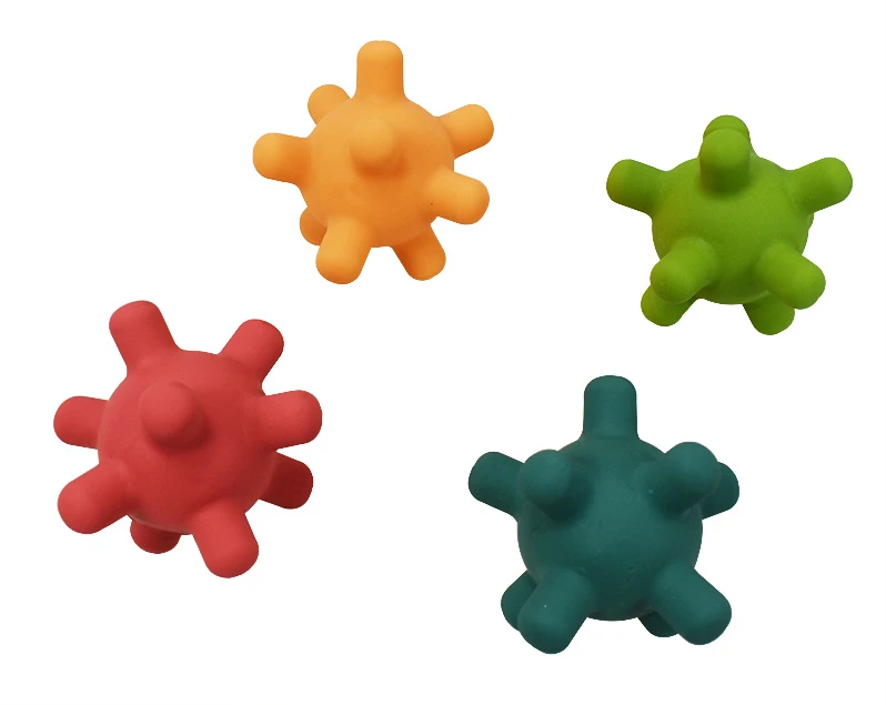 Een bal van zacht kunststof, met allemaal uitsteeksels.