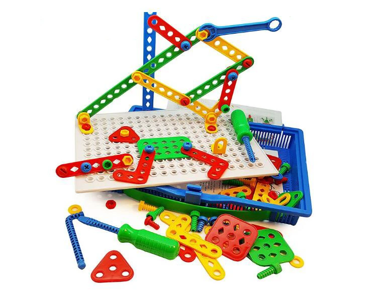 Dit is een mecano-achtige bouwset met verschillende maten plankjes, schroeven, moeren, bouten en natuurlijk gereedschap…. en een grondplaat!