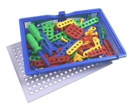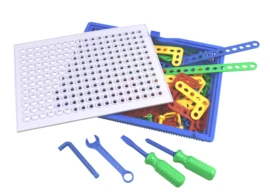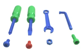 Bij de set zit een gewone platte schroevendraaier, een kruiskopschroevendraaier, een moersleutel en een imbussleutel. En voor al deze soorten gereedschap zijn er natuurlijk ook bijpassende schroeven, moeren en bouten. Dat maakt deze set ook nog eens echt educatief.