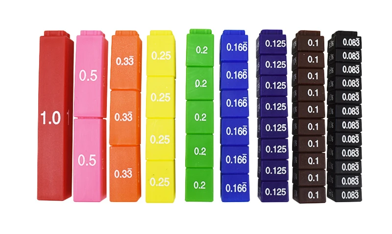 Bestaat uit 9 staven waarvan er eentje helemaal heel is (1, 1,0, 100%) eentje is verdeeld in 2 stukken (1/2, 0,5, 50%) eentje in 3 stukken, en ga zo maar door.