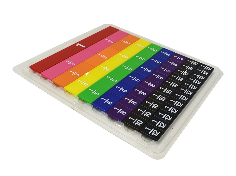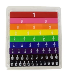 Deze set bestaat uit allemaal kleine tegeltjes. De bovenste is 1. Daaronder zitten 2 halve, daar onder 3 derden, enzovoort.