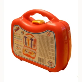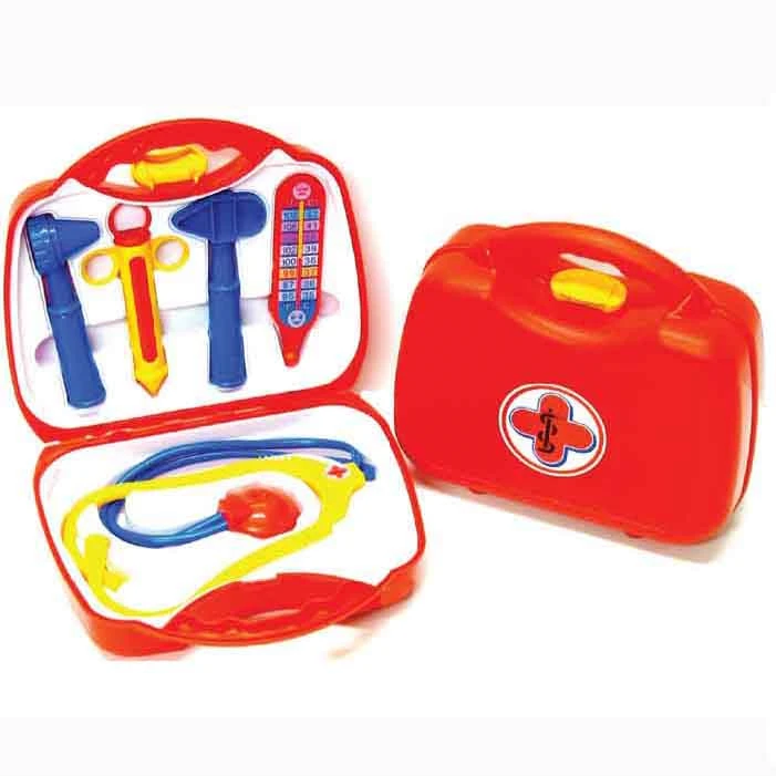 Kunststof koffertje met een orenkijker, een hamertje, een spuit, een thermometer, een stethoscoop en een rolletje verband.