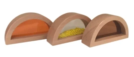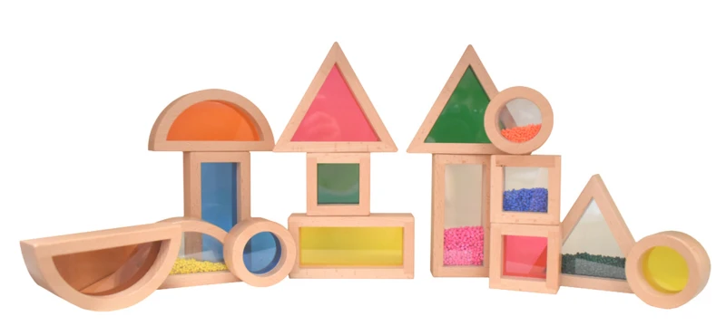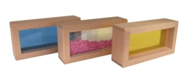 Er zijn 5 verschillende vormen, en van elke vorm zijn er 3 blokken. Twee van die blokken hebben een gekleurd venster en de ander heeft een venster van dubbel plexiglas voor de helft gevuld met gekleurde korrels. Deze korrels zitten er los in en bewegen dus als je het blok draait.