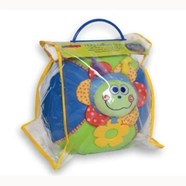 Aan de voorkant van de bal zit een gezichtje met een bijtclip en in de bal zit een belletje dat zachtjes rinkelt als je de bal beweegt.
