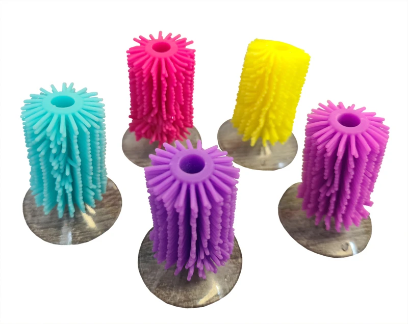 Met de zuignap maak je hem eenvoudig vast op een glad oppervlak (beetje nat maken zorgt dat hij nog beter vastzit). Dan kan je hem alle kanten op buigen en duwen. Of hem tussen je vingers heen en weer wrijven. De sprietjes zijn en zacht en voelen echt fijn aan.