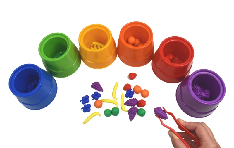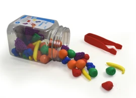 Dat gaat heel goed, want het fruit is gemaakt van rubber en is dus anti-slip. Pak het fruit op en sorteer het op soort en kleur en ondertussen kan je ze tellen.