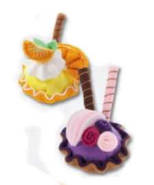 In de set zitten 5 grote vellen vilt en 7 kleine. Zes kleuren garen, een naald en vulling. En natuurlijk een gebruiksaanwijzing en sjablonen om alle gebakjes die je hier op de foto’s ziet te maken.