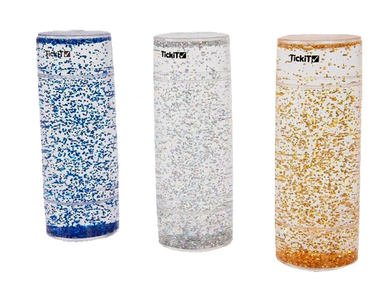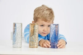 Magische glitter cilinder waarin de gekleurde glitters alle kanten op dwarrelen als je er even mee schud.