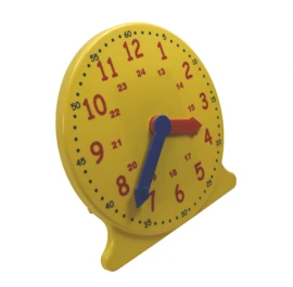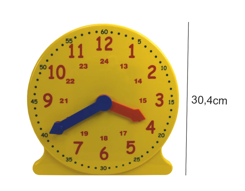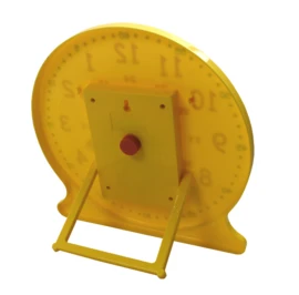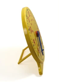 De klok is ruim 30cm hoog en kan neergezet worden met een uitklapbare standaard. Aan de achterkant zit een knopje waarmee je de wijzers kan draaien.