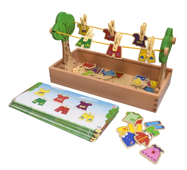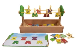 Het geheel zit in een handige houten opbergbak met schuifdeksel. Alle onderdelen (de bomen, de waslijnen, de knijpers, de voorbeeldkaarten en alle kledingstukken) passen in de kist.