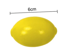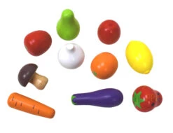 Tien stuks groente en fruit, gemaakt van hout.