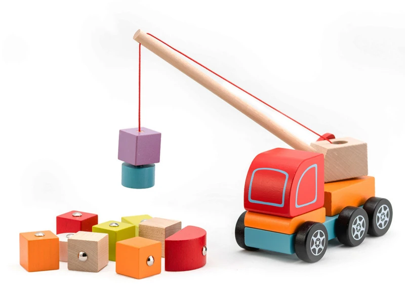 De hijskraan is voorzien van magnetische takel en wordt geleverd met een heleboel blokjes met een stukje metaal eraan; die kan je dus allemaal omhoog hijsen met de hijskraan.