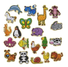 Set van 20 houten magneten met de afbeeldingen van verschillende dieren erop.