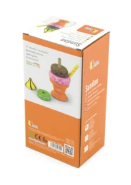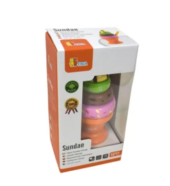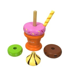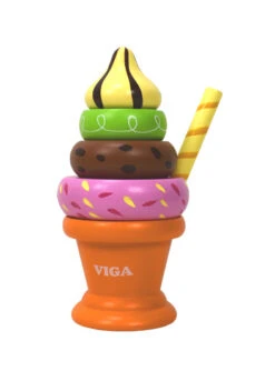 De sorbet is een stapeltoren van 4 ringen en het stokje (koekje) steek je er aan de zijkant schuin in.