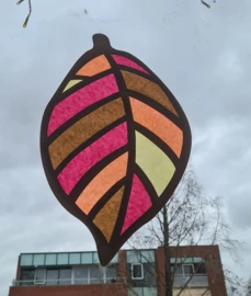 Leuk om te beplakken, of te beschilderen. Of zoals het showmodel dat ik op de 2 laatste foto’s heb gemaakt; vlakken opensnijden met een mesje (of prikpen) en aan de achterkant beplakken met vliegerpapier. Dan krijg je een geweldig leuke raamhanger voor de herfst.