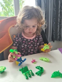 We hebben ook een setje met klei mannetjes, dat zijn figuurtjes waar je echt poppetjes (mensjes) mee maakt. dat kan met deze ook, maar hier zitten ook gekke handjes bij en en een ondelijf met 6 pootjes en vleugeltjes; meer om echt gekke monsters te maken dus.