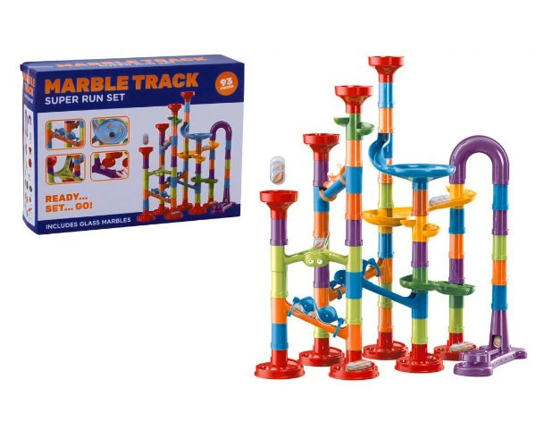 Deze grote baan bestaat uit maarliefst 93 onderdelen (inclusief knikkers) waarinder twisters, trechters, een driewegspliting en een afschieter.