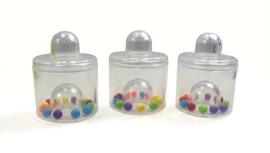 Als extraatje zitten er dan ook nog 3 transparante noppen bij die gevuld zijn met kleine kraaltjes. Leuk om mee te rammelen en om naar te kijken.