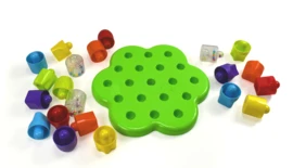De gekleurde noppen steek je eenvoudig in de gaten in het bord. Daar passen ze goed en makkelijk in. En ook kan je de noppen op elkaar zetten en er zo mee stapelen.