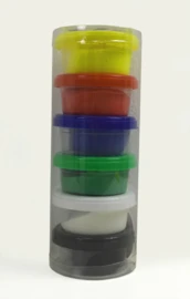 Een set met 6 potjes lightclay in de kleuren geel, rood, blauw, wit, groen en zwart.