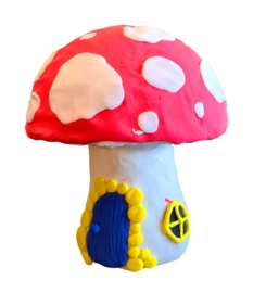 De paddestoel heb ik gemaakt door een grote bol piepschuim in tweeën te snijden en zo’n halve bol op een wc rolletje te plakken (met een lijmpistool). Dat heb ik bekleed met lightclay.
