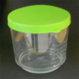 Set van 6 transparante maatbekers met gekleurde deksels.
