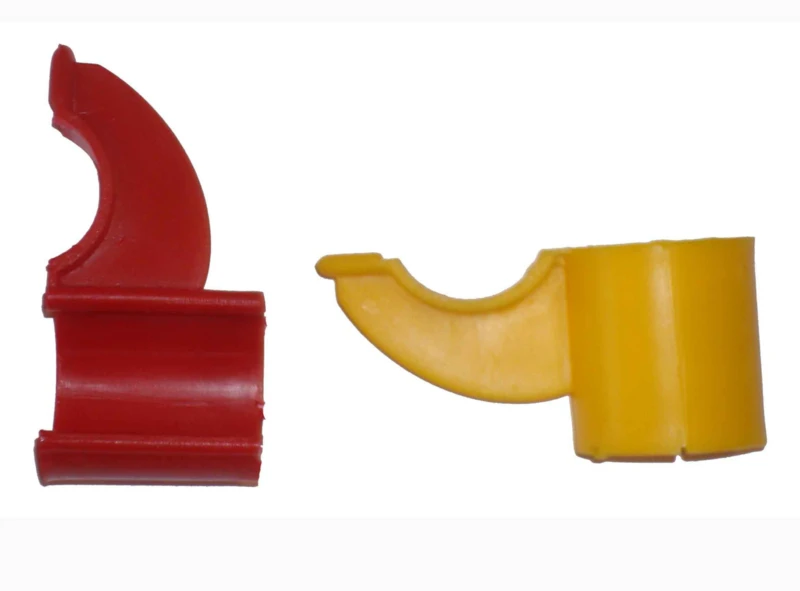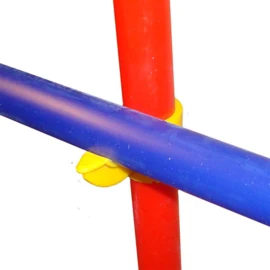 Met deze clip kan je een stok ondersteunen. Je bevestigd de clips aan 2 rechtop-staande stokken, dan kan je er een derde stok op leggen. Deze zit dan los. Als je er tegenaan loopt valt hij er dus af. Dat betekend dat een klein kind zich er niet zo snel aan zal bezeren.