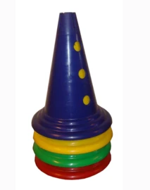 Een stevige pilon met een hoogte van 30 cm. Deze pilonnen hebben aan 4 kanten 3 gaten onder elkaar om een gymstok in te steken. Doordat de rijen gaten tegenover elkaar zitten kan je de stok helemaal door de pilon heen steken.