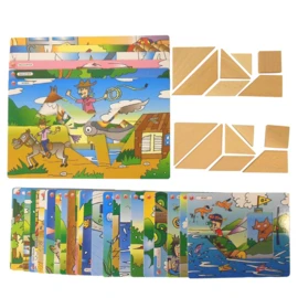 Een bijzonder tangram spel met grote blokjes en inlegkaarten. Met de tangramblokjes vul je de openingen van de voorbeeldkaarten. Als je de kaart gevuld hebt zie pas goed wat er op het plaatje staat.