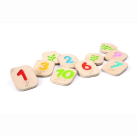 Set van 10 tactiele plankjes waar in kleur een groot cijfer opstaat. Dit cijfer is eruit gesleoen; het is hol en je kan hem dus voelen. Daaronder staat hetzelfde cijfer, maar dan in braille.