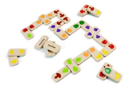 Dominospel dat je niet alleen kan zien, maar ook kan voelen doordat de plaatjes van groente en fruit in de stenen zijn geslepen.