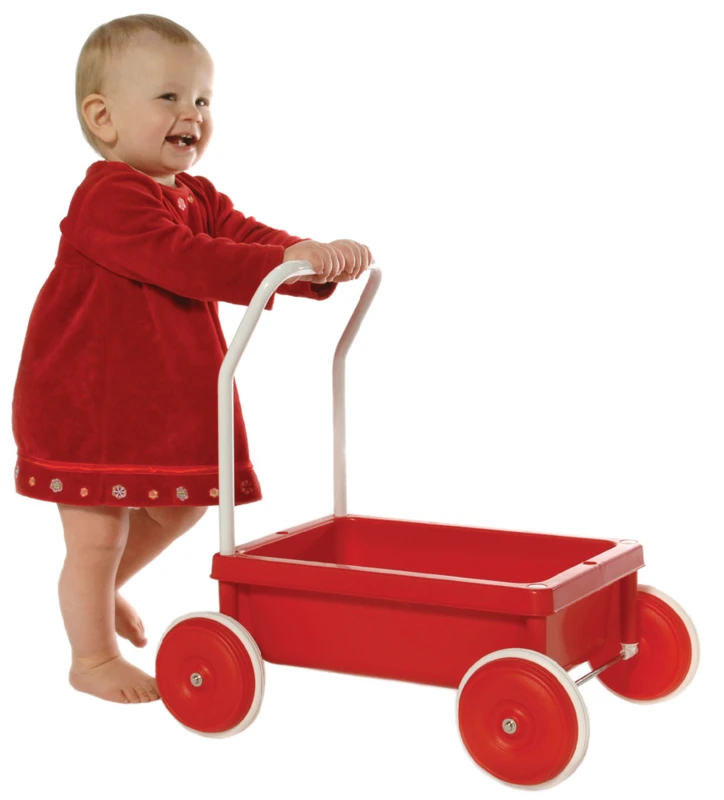 Met remsysteem op de achteras die je zelf in kan stellen. Daarmee voorkom je dat het karretje er ineens vandoor gaat als je loopt.