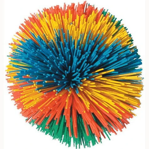 Kleine bal met een diameter van 7,5 cm die er uitziet als een pompom (zo’n sprietig, wollen balletje dat bovenop een muts zit). Alleen is deze bal niet van wol, maar van rubber, De sprietjes zijn dan ook elastisch.