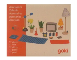 In dit setje zit een sta-lamp, een kleine lamp en een bureaulamp, een televisie, een radio, een kaars, een klok, 5 boeken, 2 kleedjes en een kussen.