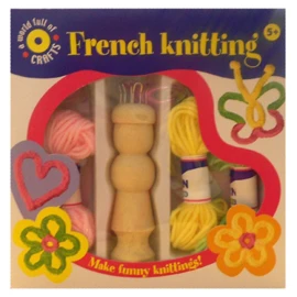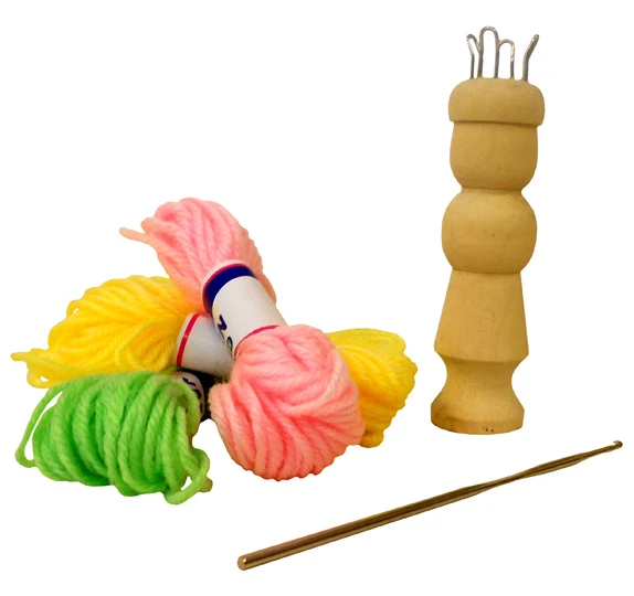 Hierin zit een houten punnik klosje, een haaknaald en 3 bolletjes wol.
