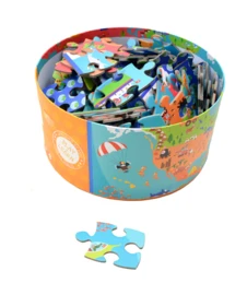 De puzzel zit opgeborgen in een ronde doos met deksel.