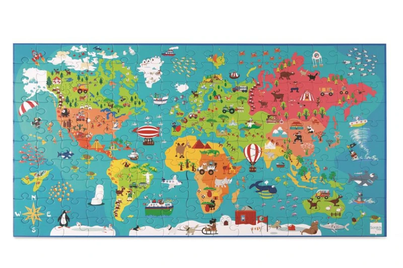 Op de puzzel staat een afbeelding van een wereldkaart met daarbij tekeningen van bijzonderheden uit elk land of werelddeel.