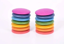Deze set bestaat uit 14 discs. Dat zijn schijven die aan de ene kan t plat zijn en aan de andere kant (een beetje) bol. In een doos zitten 14 schijven in 7 kleuren; van elke kleur 2 stuks. De schijven zijn 6cm breed.