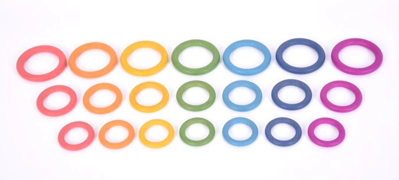 Er zitten 3 verschillende maten ringen in, van elke maat 7 stuks. De breedste ringen zijn 70mm breed, de middelste 56mm en de kleinste ringen 48mm.