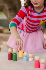 Elke familie bestaat dus uit 4 popjes in 4 verschillende lengtes. Elke famili heeft zijn eigen kleur waarin elk familielid dan weer zijn eigen tint heeft.