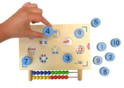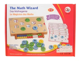 In de houten kist schuif je steeds 1 opdrachtkaart en met de houten schijfjes met getallen erop ga je dan de antwoorden invullen. Er zit een telraam bij met 20 kralen voor als je nog wat hulp nodig hebt.