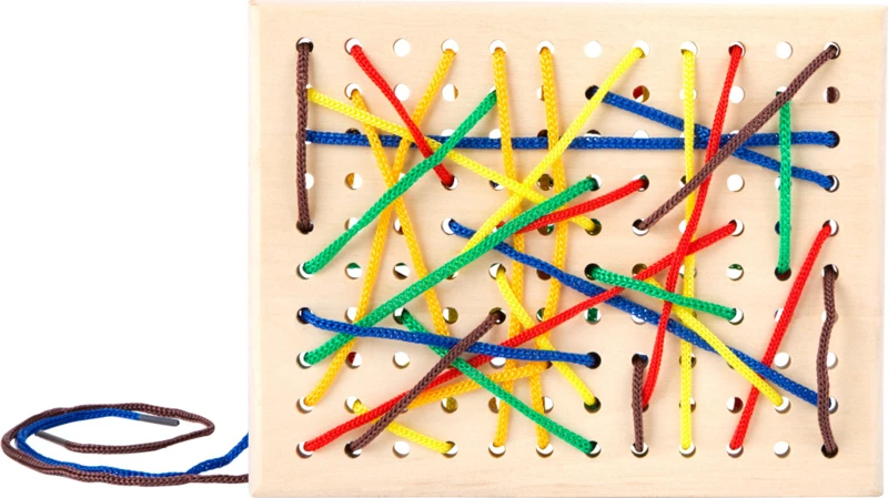Houten bord van 18 x 24cm met een heleboel gaatjes erin. Met daarbij een heleboel rijgveters in veel verschillende kleuren.