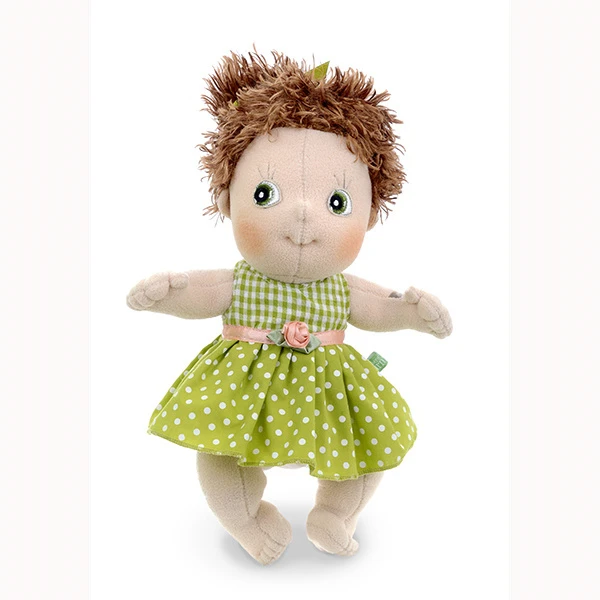 Karin is een meisjespop met rossig haar en een groen jurkje.