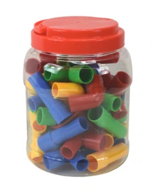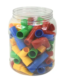 De saxo pijpleiding is een grote ton vol met pijpleiding onderdelen (recht, gebogen, T-splitsing en kruising) en 2 mondstukken en 2 toeteruiteinden.