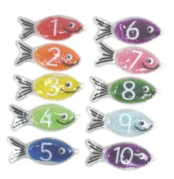 Set van 10 visjes gevuld met waterparels waardoor het heerlijk is om ermee te friemelen en aan te voelen.