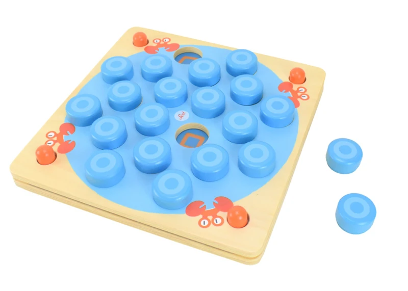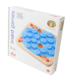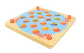 De inlegkaart leg je tussen de 2 houten platen, met als bovenste plaat de plaat met gaten waardoor je de afbeeldingen op de kaart kan zien. In de gaten leg je dan de houten noppen.