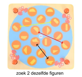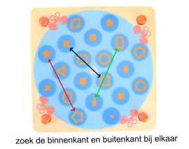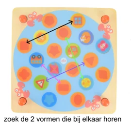 Prachtig houten memoryspel met verschillende inlegkaarten waardoor het steeds weer anders is. Op elke kaart moet je de vormen bij elkaar zoeken, maar steeds weer op een andere manier… sommige zijn echt niet makkelijk, je moet goed kijken!