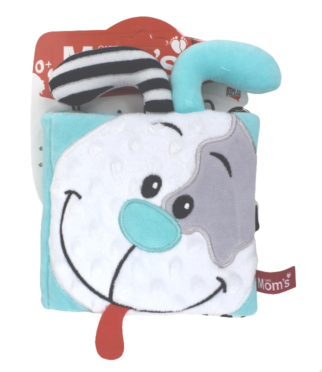 Een gezichtje op de voorkant (babies kunnen gezichten al heel snel herkennen als een gezicht, ook vanaf een plaatje), gekke oren die je makkelijk vast kan grijpen, veel verschillende texturen, scherpe contrasten zodat je het goed kan zien, een bladzijde die knispert, een bijtring en een spiegeltje.