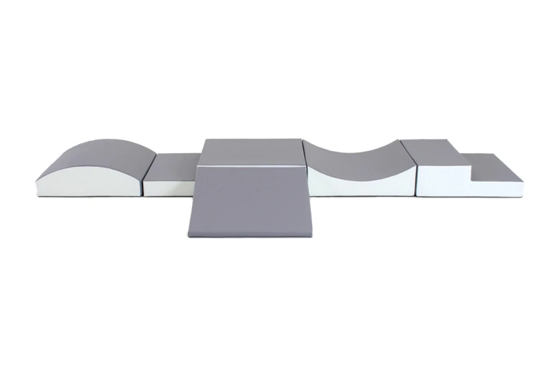 Deze 6-delige Golfbaan is uitgevoerd in grijs en wit kunstleer en past daarmee in een modern interieur en is niet dominant aanwezig. Je kunt hem neerleggen langs een wand, maar natuurlijk ook vrij in de ruimte. Deze opstelling is te gebruiken door 2 of 3 kindjes tegelijk, hoewel ze natuurlijk wel allemaal van de glijbaan afwillen. Het half-bolle element is ook een leuk wiebelkussen.