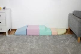 Deze Speelhoek is uitgevoerd in diverse lichte pasteltinten kunstleer en past dus goed in een hedendaags interieur. Je kunt hem neerleggen in een hoek, maar natuurlijk ook vrij in de ruimte of in een lengte-opstelling.